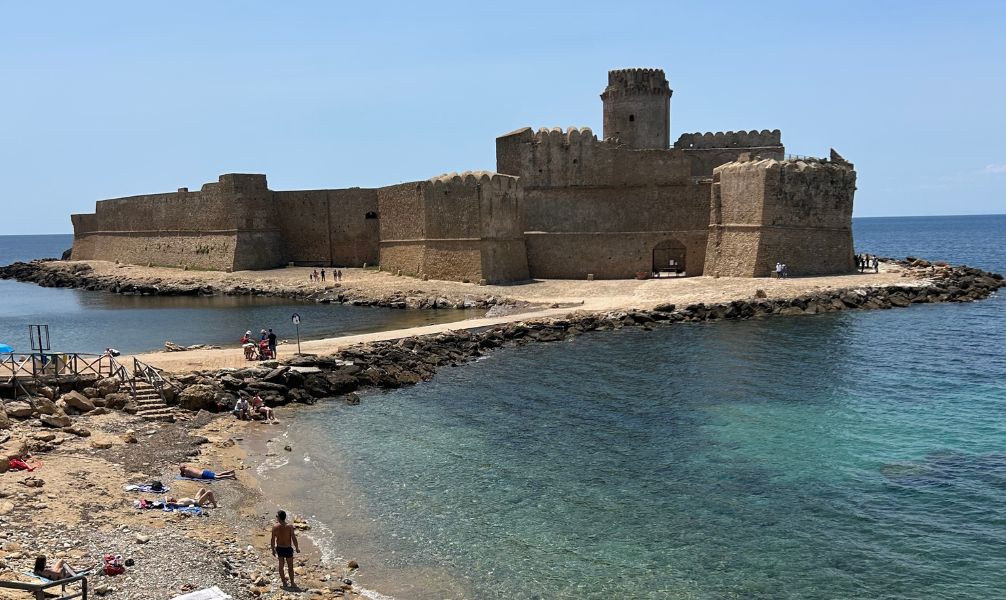 Arrivati in tarda mattinata a Le Castella, abbiamo incontrato la nostra guida che ci ha accompagnato per tutto il giorno. Ci siamo subito incamminati verso il borgo per scoprire questo bellissimo castello che sorge in mezzo al mare nei tratti più belli dell’area marina protetta di “Capo Rizzuto”, su di una sottile lingua di sabbia color d’oro.